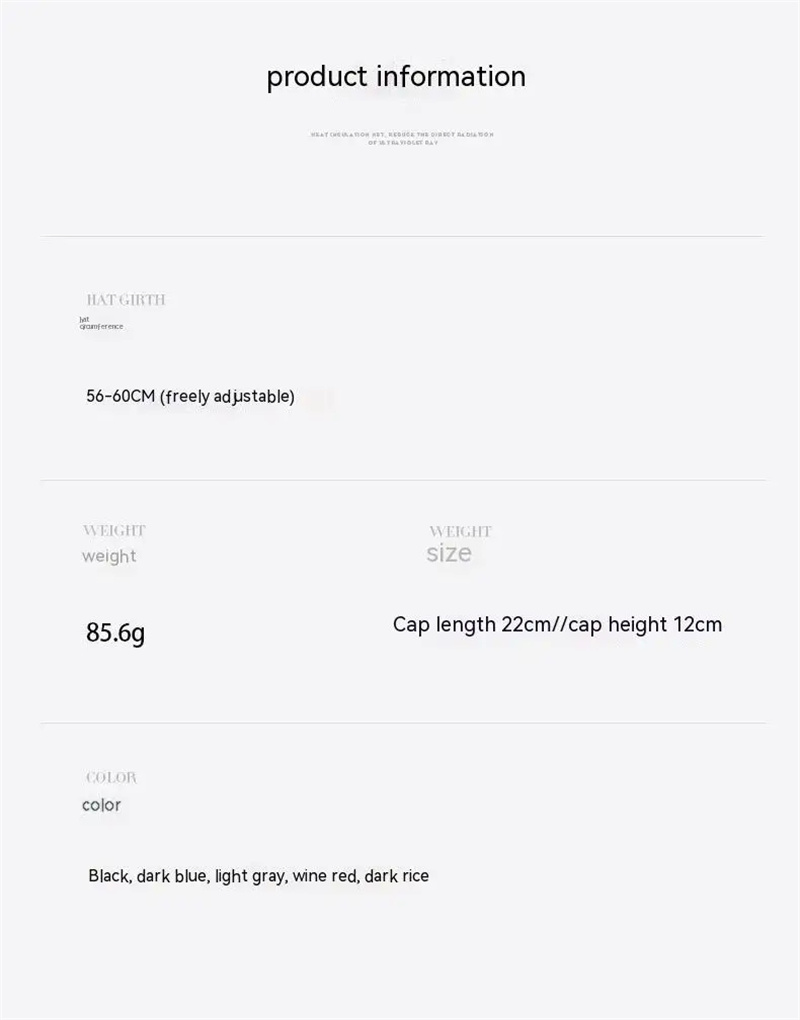 Cap circumference: 56-60cm (freely adjustable)Size: cap length 22cm / cap height 12cm