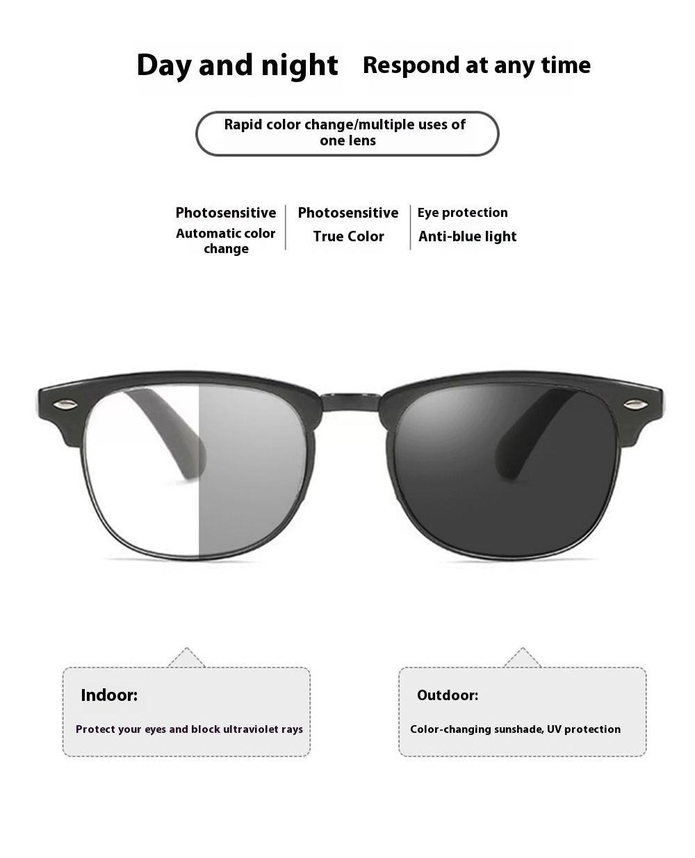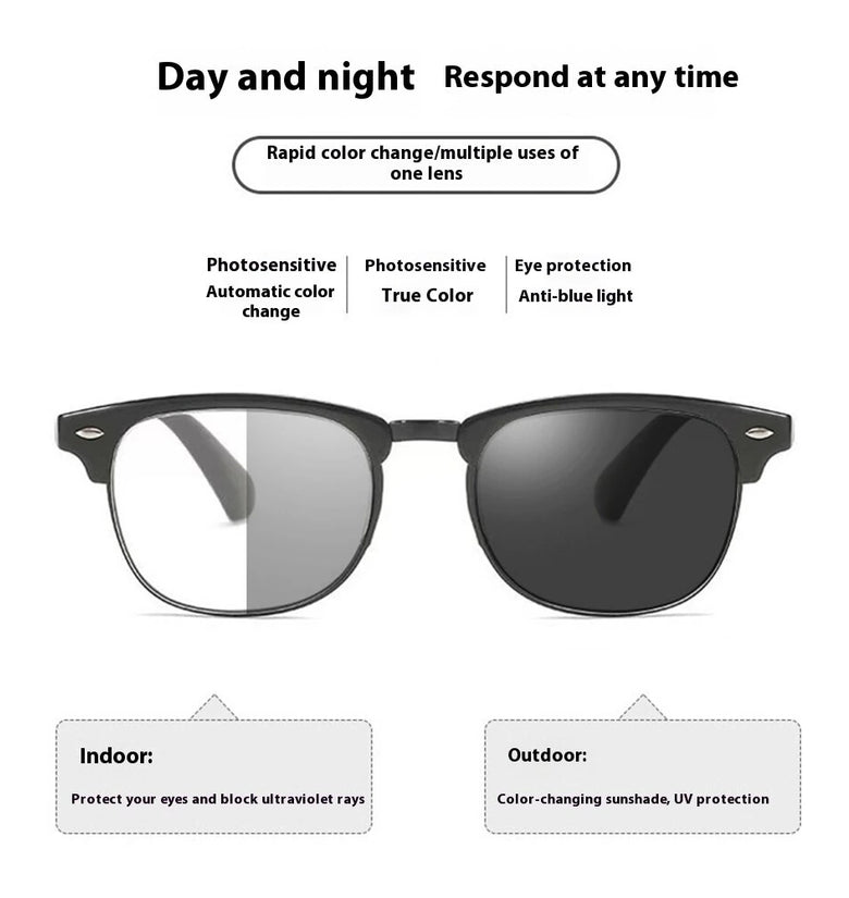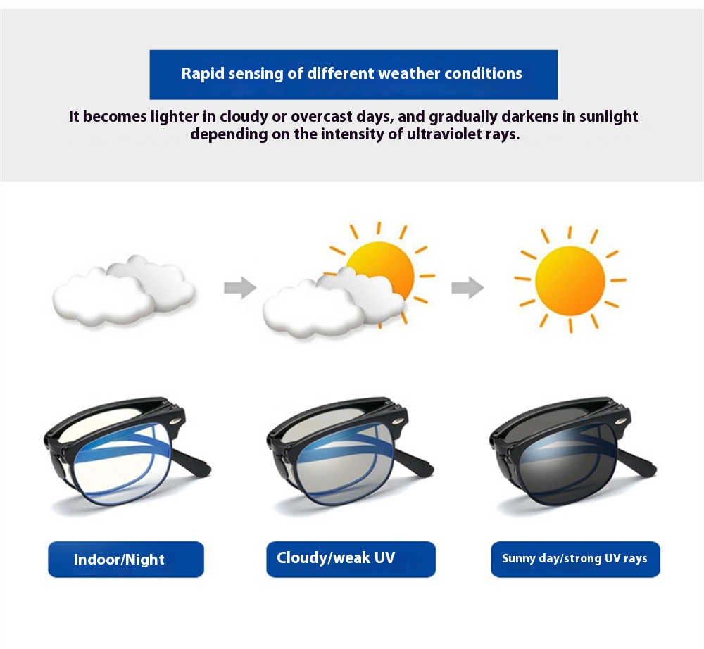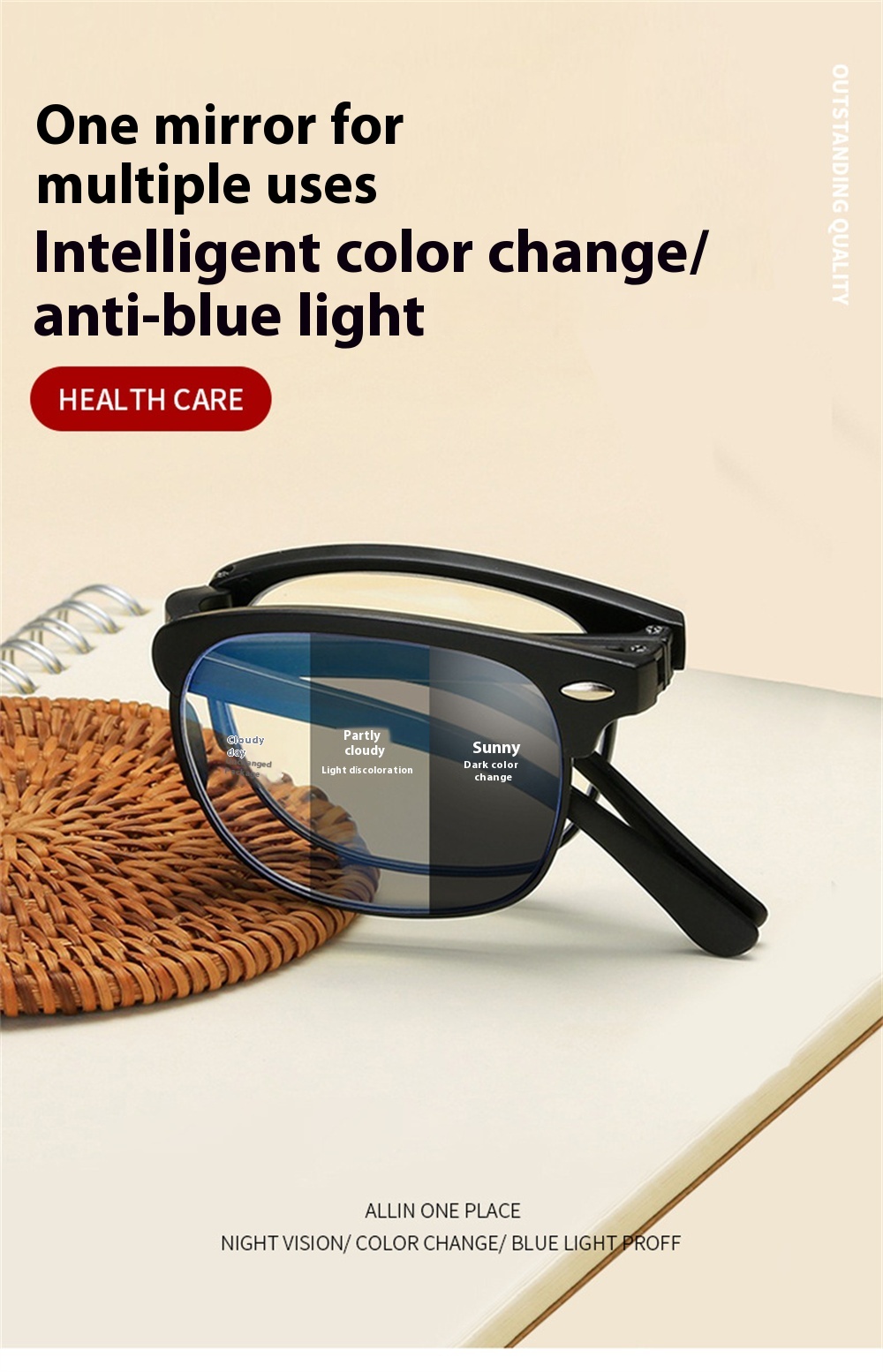 Features: 1. Transformative color-changing lenses for stylish versatility. 2. Ultra-lightweight design ensuring whole-day comfort. 3. UV and blue light protection for healthier vision. 4. Compact, foldable design perfect for on-the-go activities. 5. Suitable for various environments, enhancing outdoor adventure.