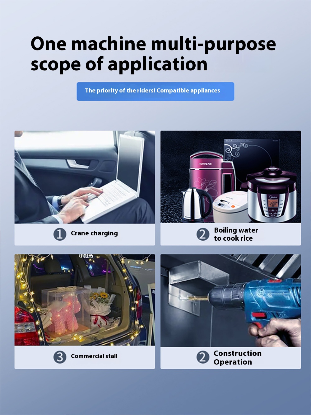 - Versatile Power Source: Our inverter provides a reliable power solution for multiple applications, including outdoor activities, home appliance use, and car charging. Whether you need to power your laptop, cooking utensils, or professional tools, this device ensures that you stay connected and operational anywhere.