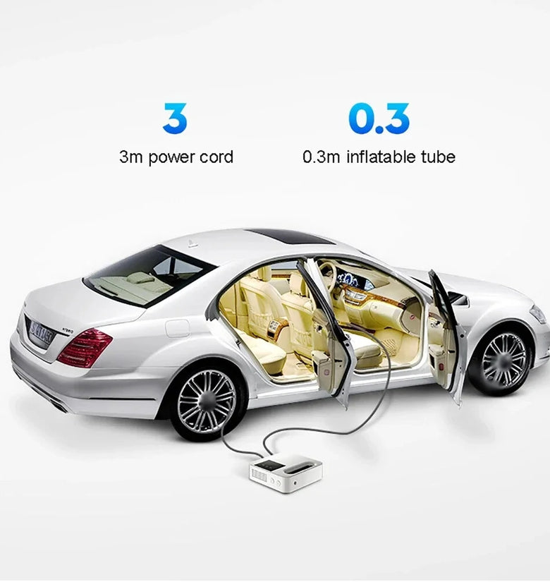 5. Wide range of applications: Using a 3-meter-long power cord and a 0.3-meter inflation tube, the air pump can easily reach all four wheels of various vehicles, including cars, MPVs, and SUVs.