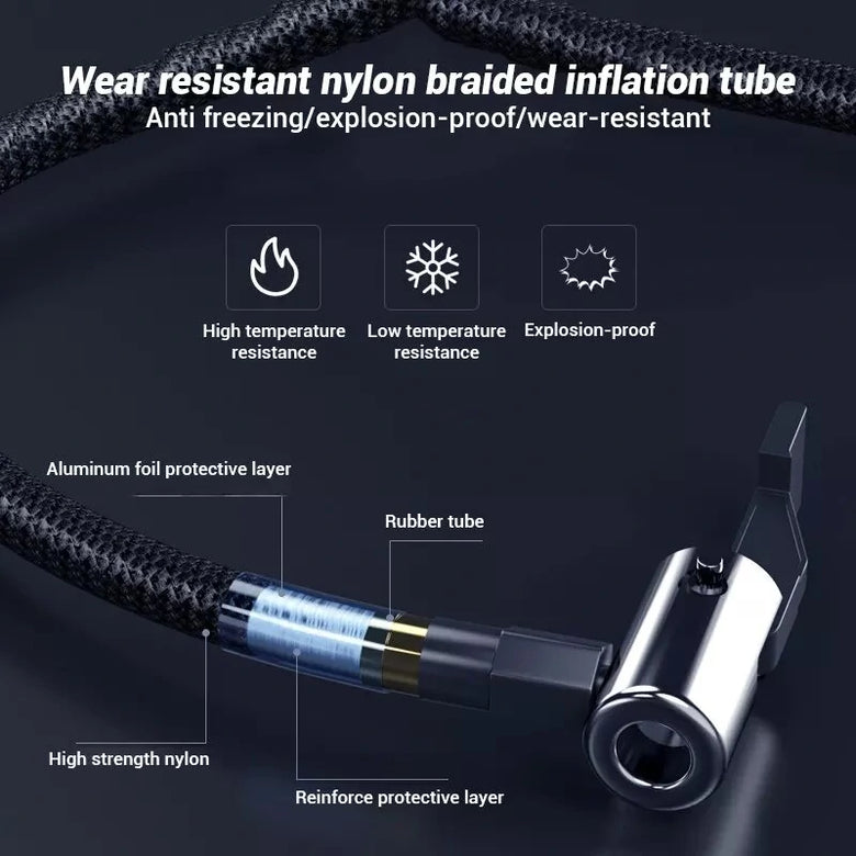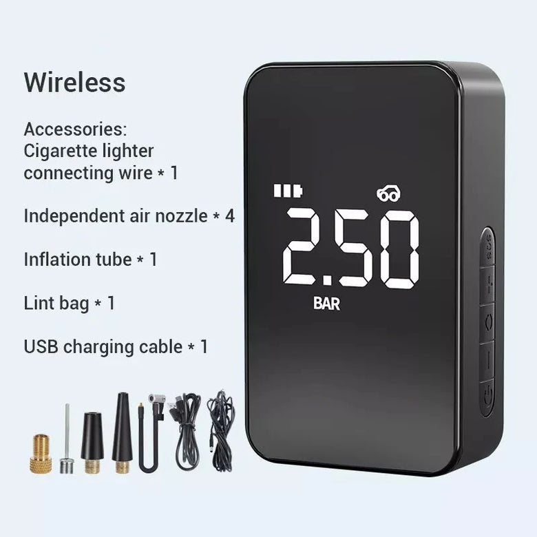 Tires air compressor Built-in rechargeable battery, can be used without external power supply. It can be easily stored in car toolboxes and backpacks, makes the inflate operation easier and more convenient.