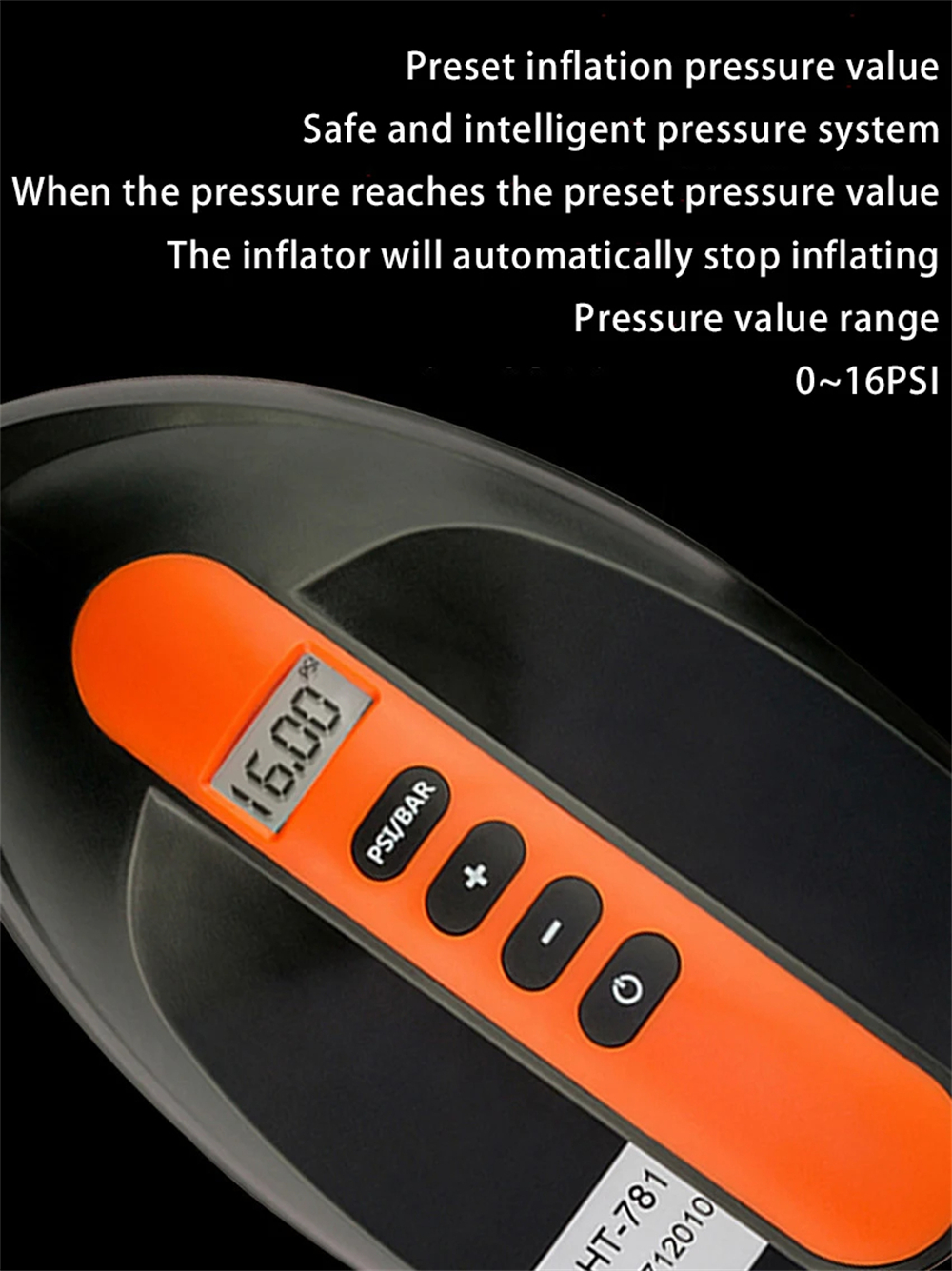 Precise LCD Display: Shows real-time pressure values with adjustable range of 0-16PSI for accurate inflation monitoring.