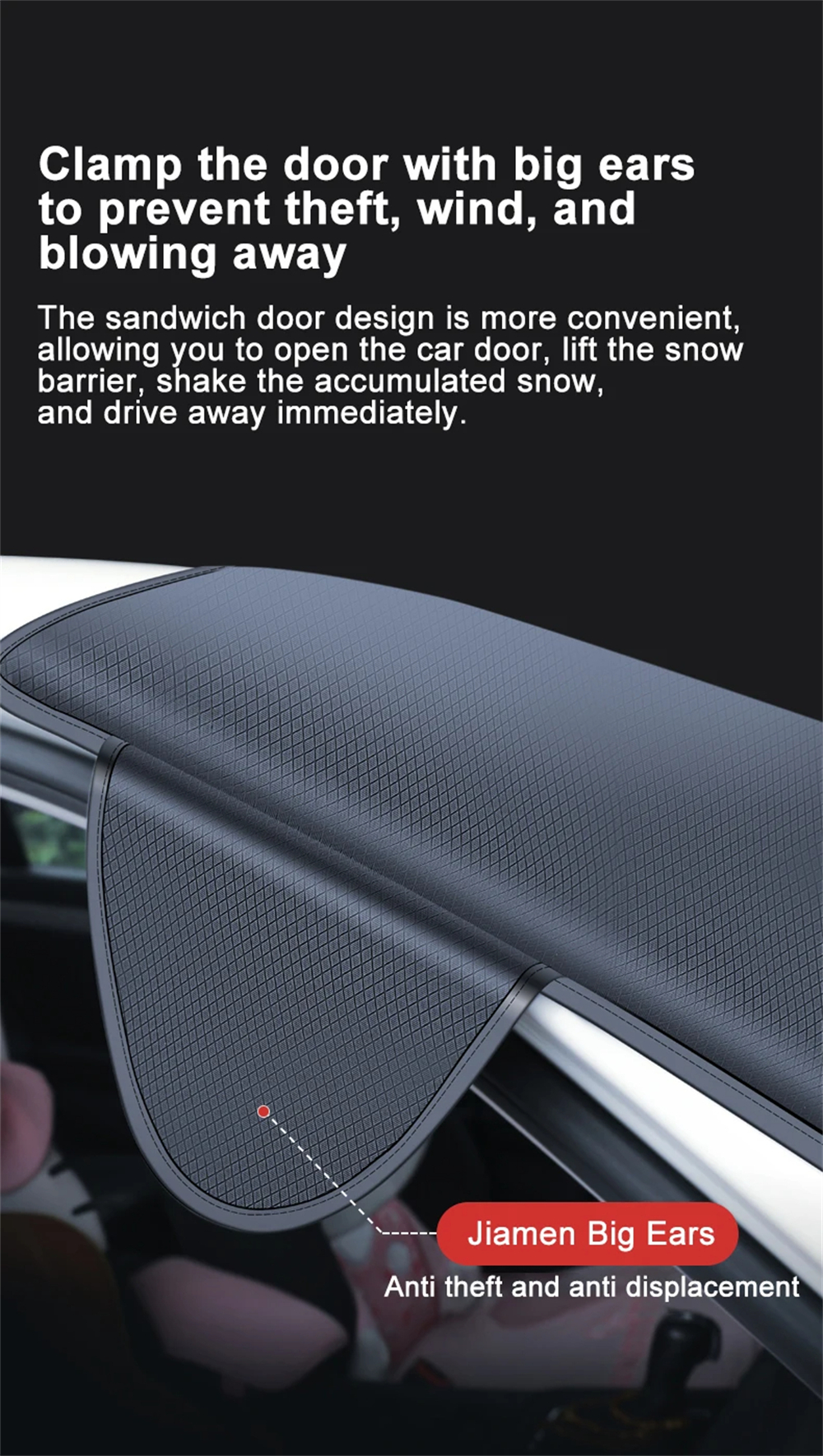 Innovative side flap design locks securely inside car doors, adding protection against gusts of wind and accidental theft.
