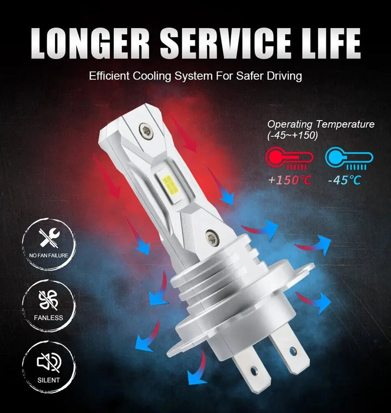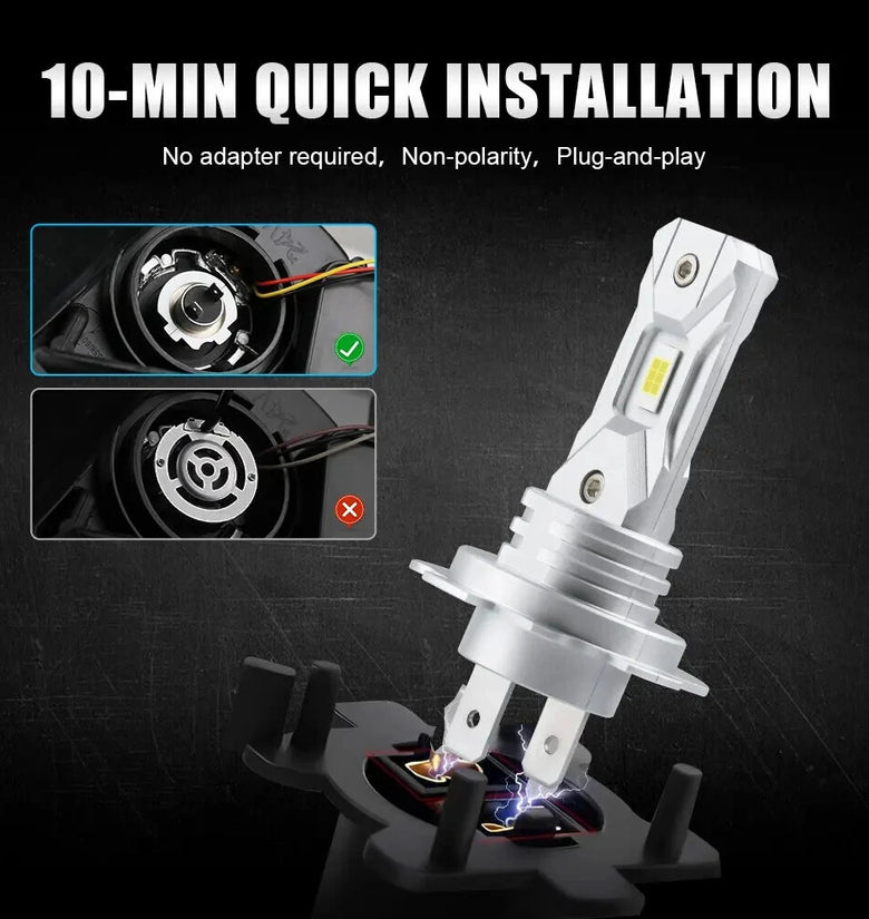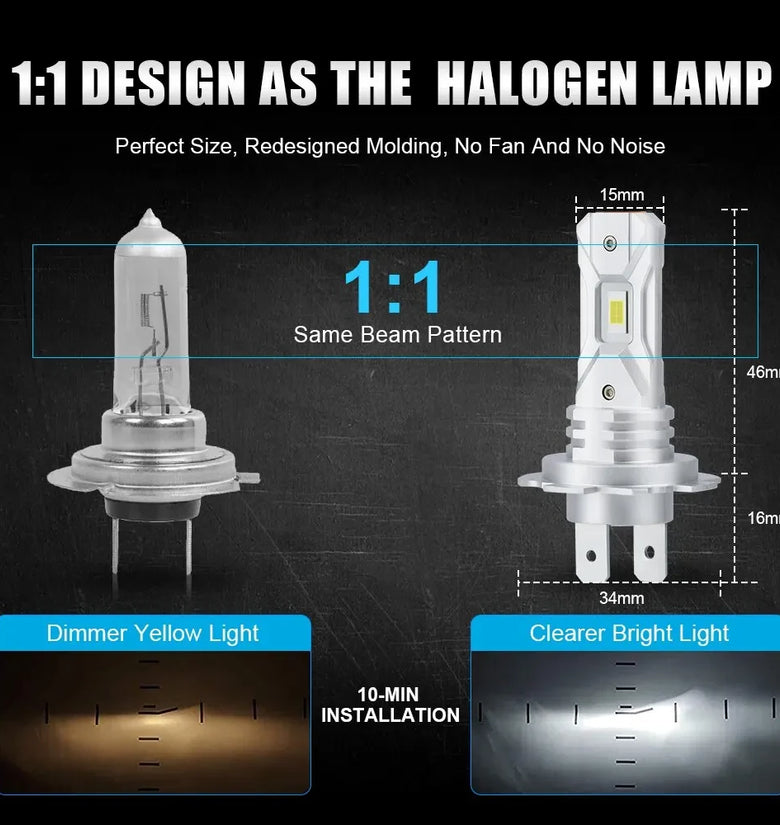 -- Size 1:1 halogen bulb design, 300% brighter, no reflection to oncoming people, plug and play, easy installation. No additional adapter is required to install H7 bulb.