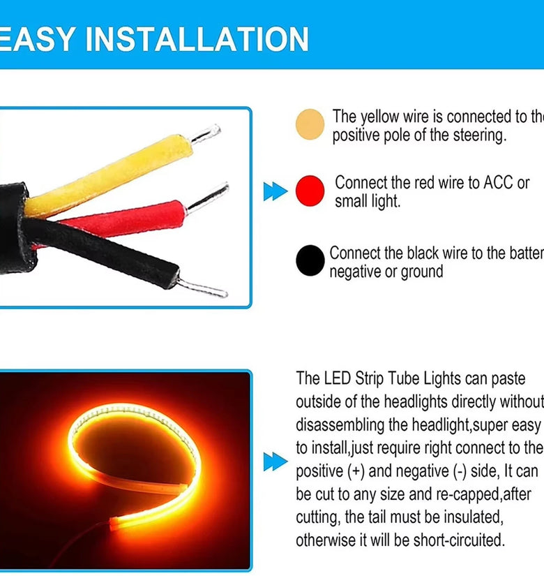 -- Easy to Install: Installing this LED light is simple. Just stick it on the outside of the headlight and connect the wires. The red wire connects +12V/ACC, the black wire connects - GND/ground (negative power), and the yellow wire is used for conversion signal (+), the whole process is intuitive and fast. For users who only use white light, only the red wire and the black wire are needed.