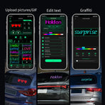 - Flexible Installation: Made from premium flexible LED panels, the screen is super thin and lightweight. Its flexibility allows it to be easily folded and bent to fit both flat and curved surfaces. The waterproof adhesive polymer coating ensures easy installation on your car's windshield, regardless of the surface form. Ideal for dynamic visual effects, the screens can be paired on front or rear windows for maximum impact.