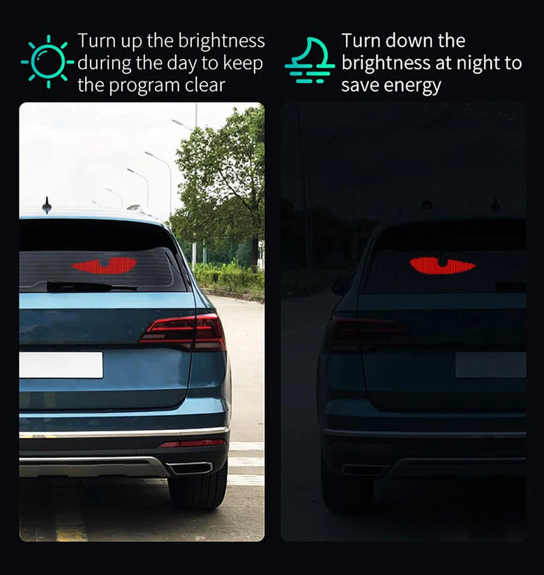 - Pattern Switching and Customization: The Devil Eyes LED display allows seamless switching between various pre-set devil's eye patterns. With the associated mobile application, you are capable of uploading exclusive patterns, texts, and animations. This feature brings a personalized touch, enabling users to make their vehicle décor uniquely their own.