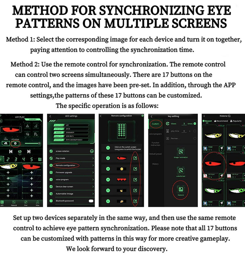 - Multilingual Remote and APP Control: Supporting 13 languages, the Devil Eyes display can be controlled either through a remote or a mobile app. You have the option to choose your preferred method. Note that while the remote can handle both screens simultaneously, the app manages one screen at a time. This provides flexibility and convenience tailored to each user's preference.