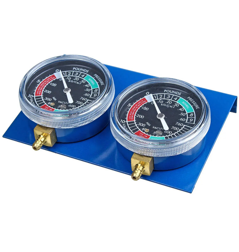 - Each unit includes precision gauges mounted on a robust metal base for worktop use, threaded brass carb extensions