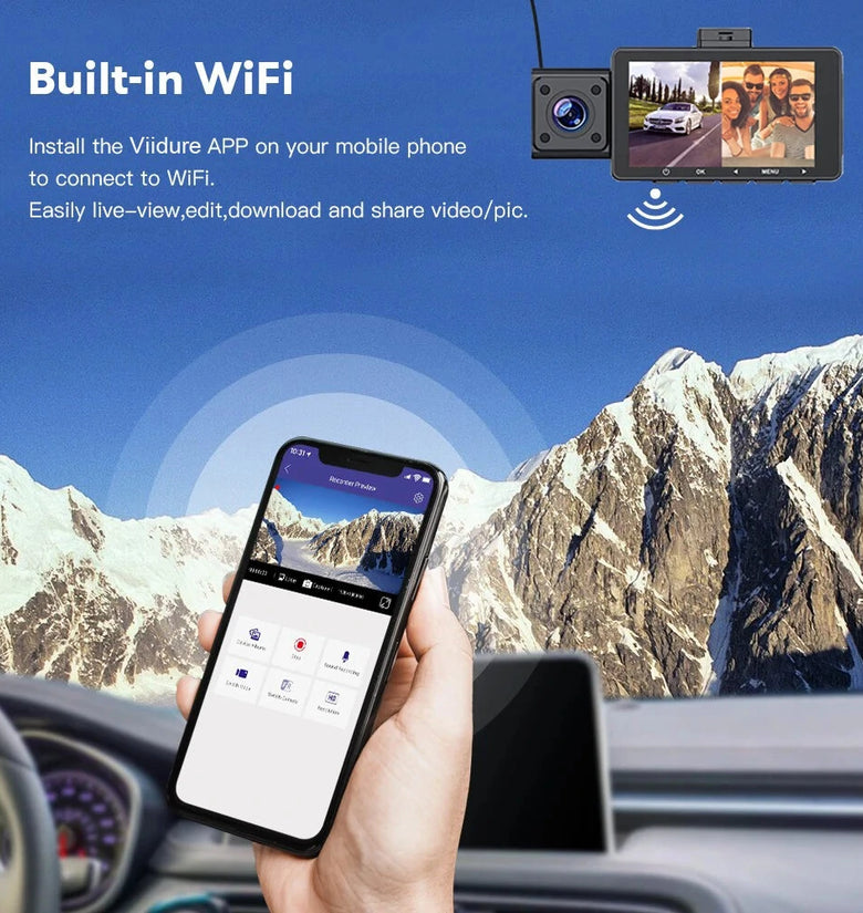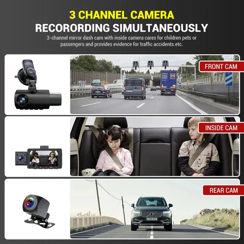 -- Front & Cabin & Rear Camera Support: The car dash cam is capable of recording footage both from the front, cabin, and rear of the vehicle, providing a comprehensive view of the surroundings and the interior.