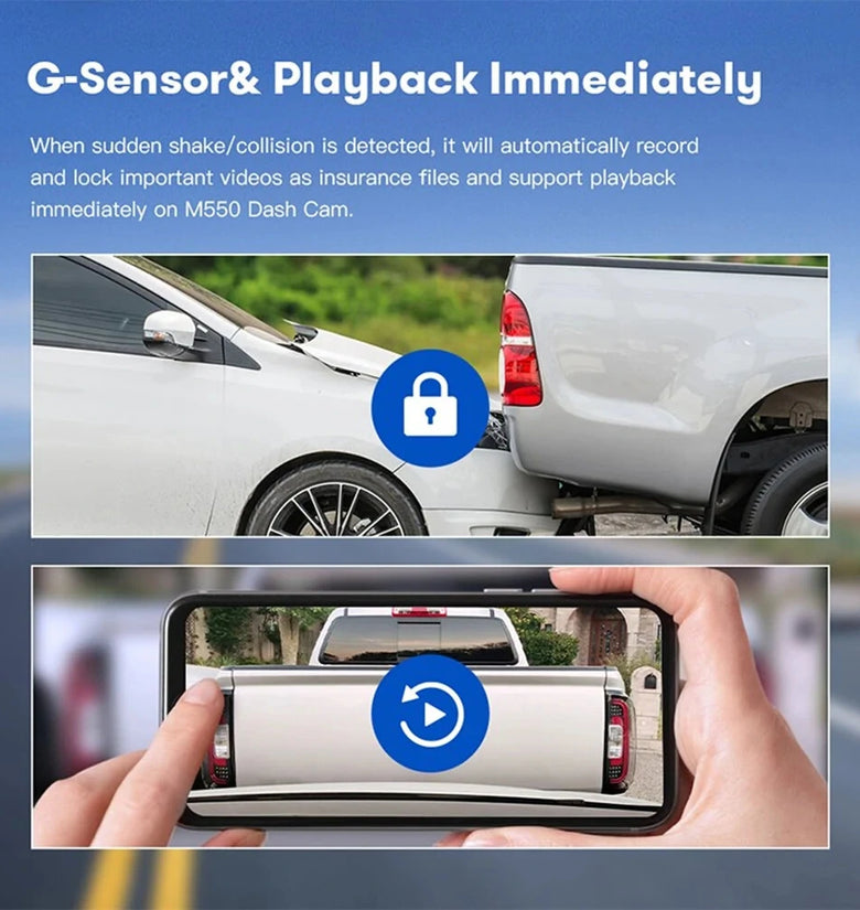 The built-in G-sensor in Dash Cam activates upon impact and records videos of up to 1 minute. The 3-axis Impact G-sensor data ensures precise emergency recording of when and where the impact occurred and dockets the file to aid the further investig