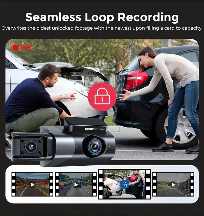 - Triple Coverage Recording: Capture every angle with three separate lenses for front, interior, and rear views, providing comprehensive surveillance while on the road, ensuring no detail goes unnoticed.