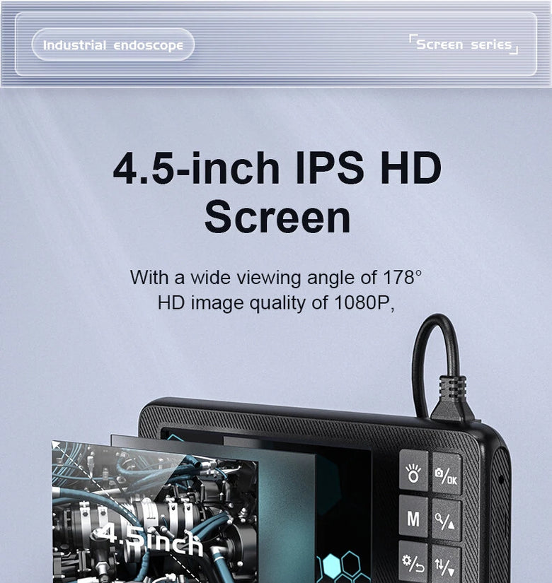 1. 4.5 inch LCD Screen: The Industrial Endoscope Camera is equipped with a 4.5 inch LCD screen, providing a clear and convenient display of the inspection results. This feature enables users to easily view and analyze the captured footage without the need for additional external devices.