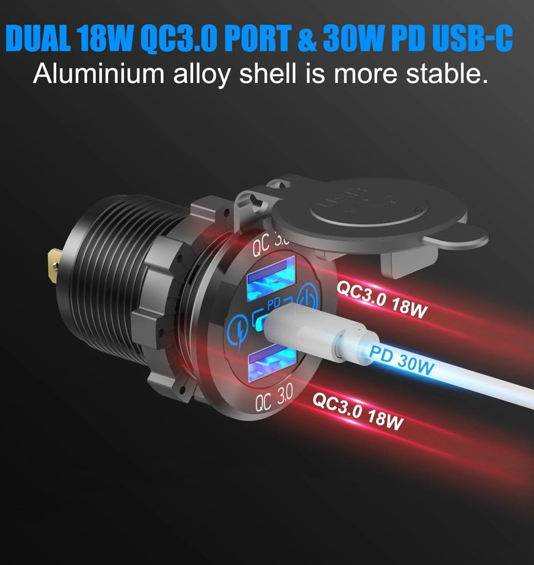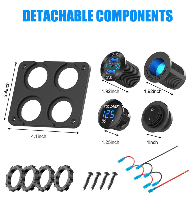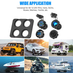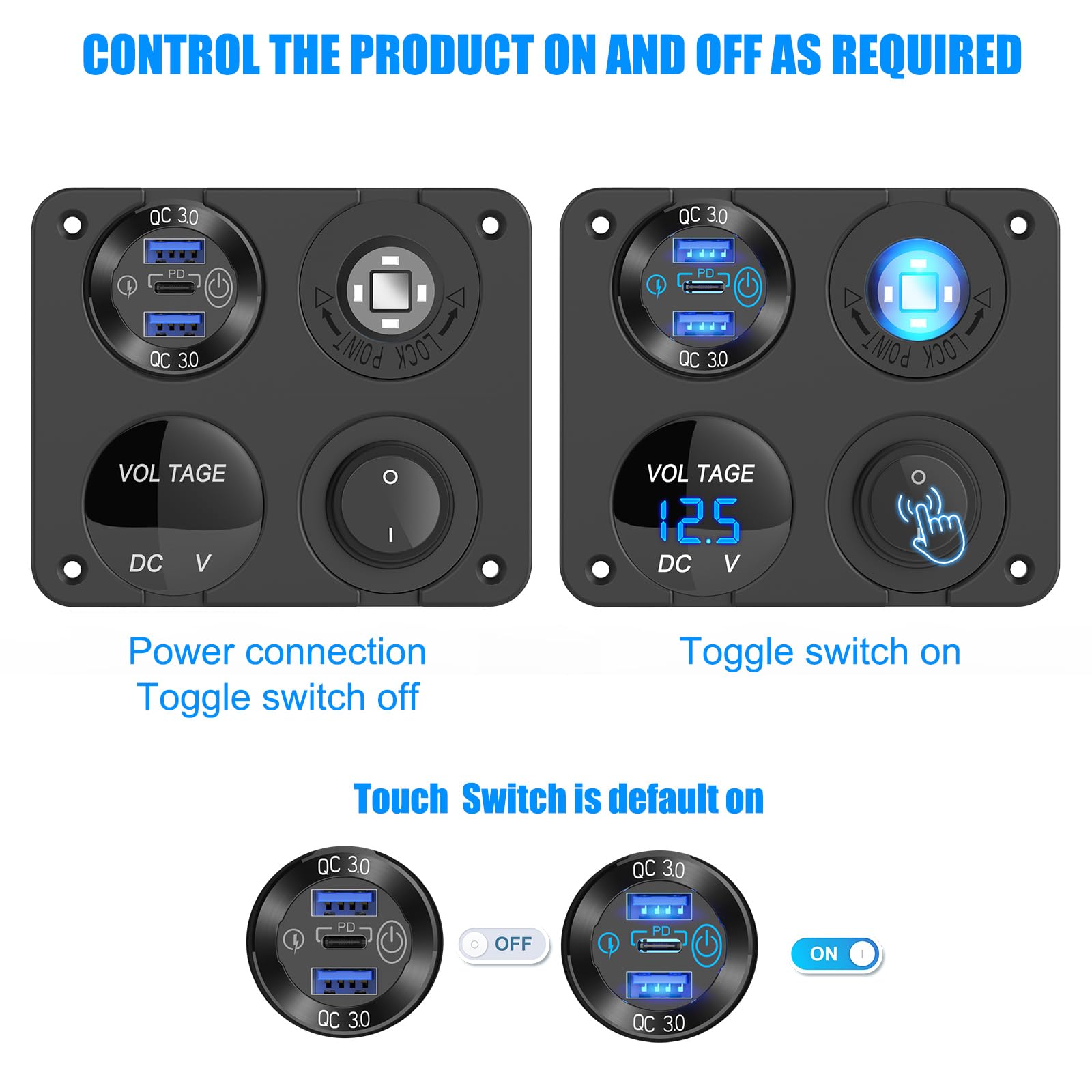 • 4 In 1 12V Marine Switch Panel Dual PD30W QC18W Car USB Port Aluminum Charger Lighted 150W Car Socket Blue LED Voltmeter and Rocker Switch