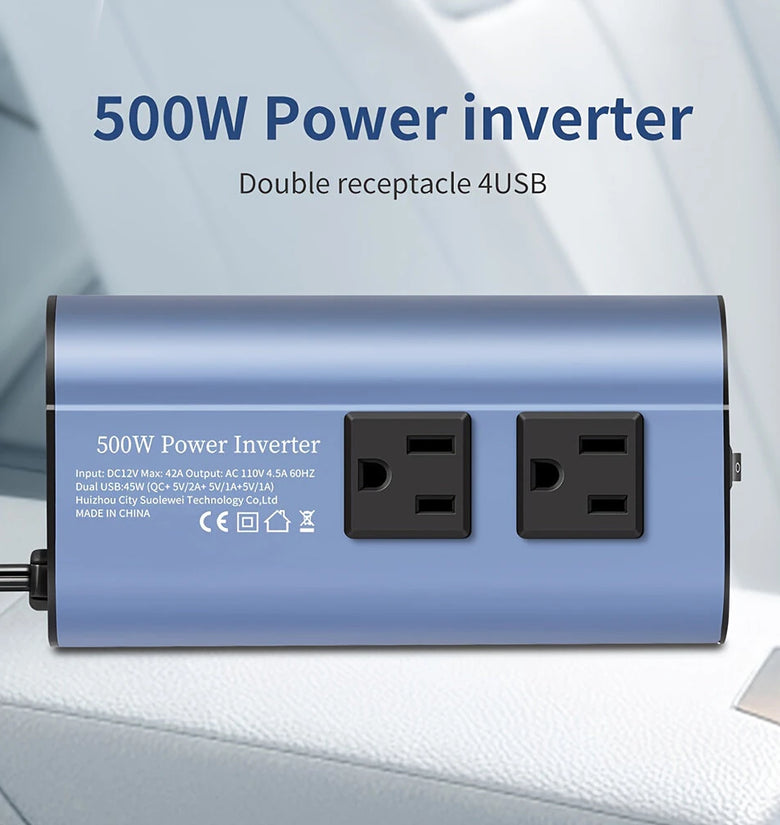 Equipped with two 110V AC outlets that provide 300W continuous power and 500W peak power, this inverter is perfect for charging multiple electronic devices simultaneously, such as laptops, tablets, and cameras.