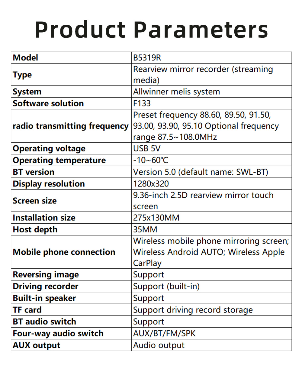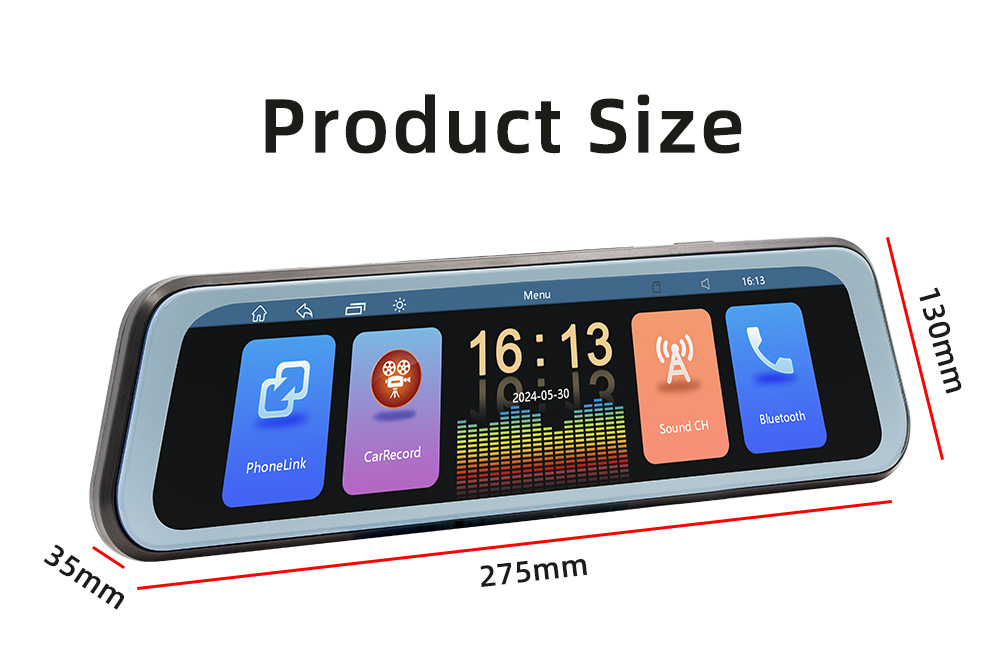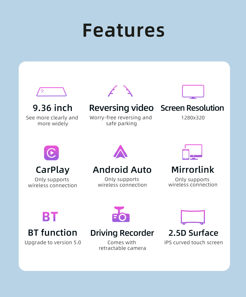 Screen size: 9.36-inch 2.5D rearview mirror touch screen