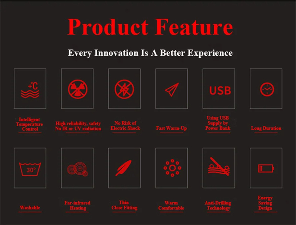 - USB-Powered Heating System: Compatible with any power bank for convenient usage on the go, ensuring long-lasting heat throughout the day.