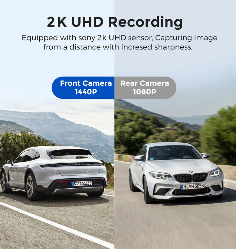 Dual HD Camera Setup: Includes a 2K front camera with 1440P resolution and a 1080P rear camera, ensuring crystal-clear footage both front and back for your driving safety.
