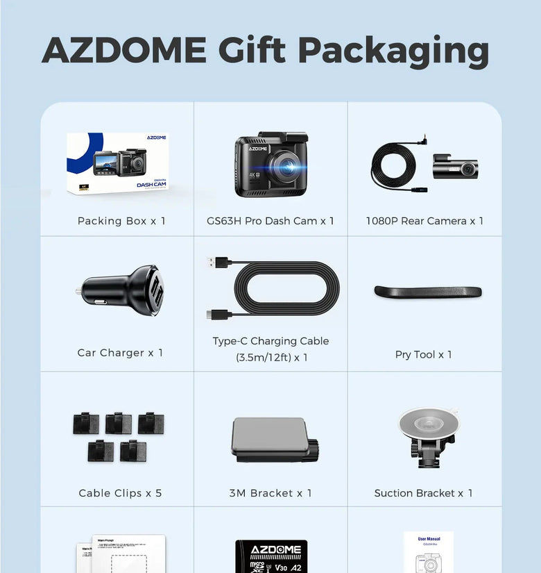 • AZDOME GS63H Pro 2CH Dash Cam 4K with Super Night Vision 24H Parking Mode With 64G Memory Card Dual Dash Cam 4K+1080P Front Rear Cameras