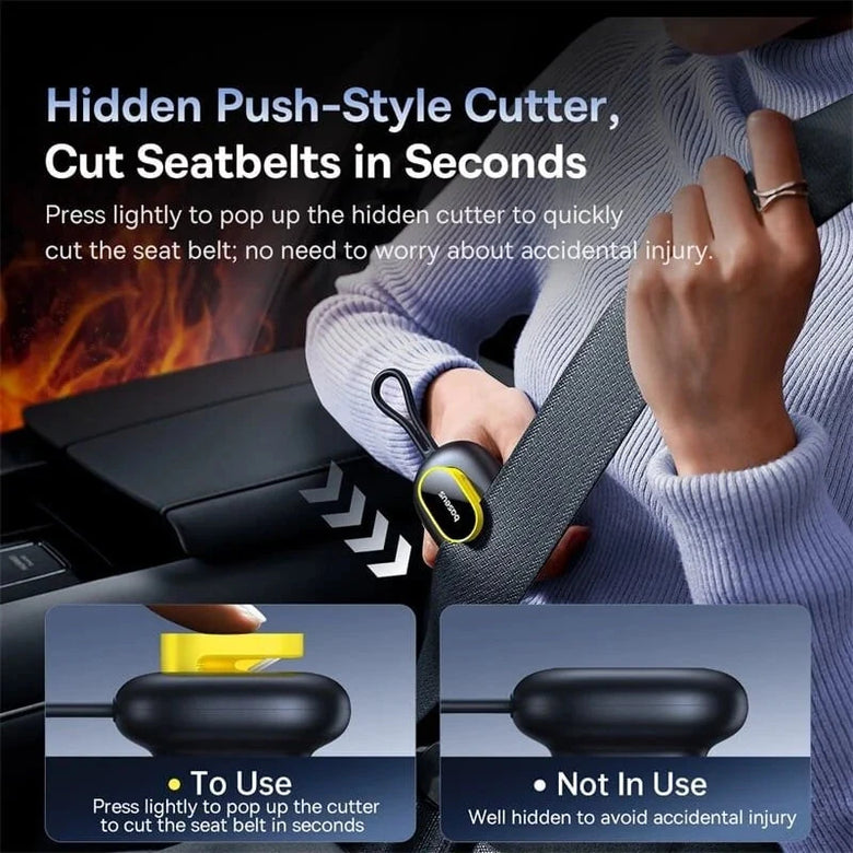- Hidden Push-Style Cutter: The discreet push-style cutter is easily accessible yet safely hidden to prevent injuries. Simply press to release the sharp blade and cut through seatbelts in seconds.