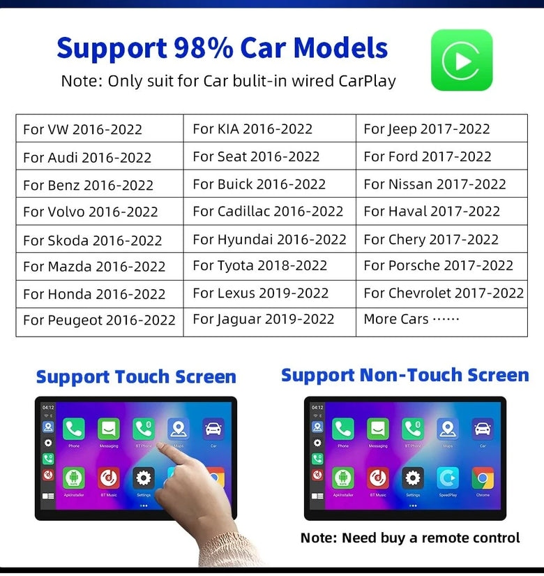 Basically compatible with genuine and wired car models equipped with CarPlay after 2016, but it is not guaranteed to work with all vehicles equipped with CarPlay. Be sure to pre-test your vehicle. If your car doesn't support CarPlay, it's 100% unusable. As a way to confirm, you can check that CarPlay is available by plugging your iPhone into the USB port of your car stereo via the lighter cable.