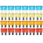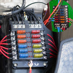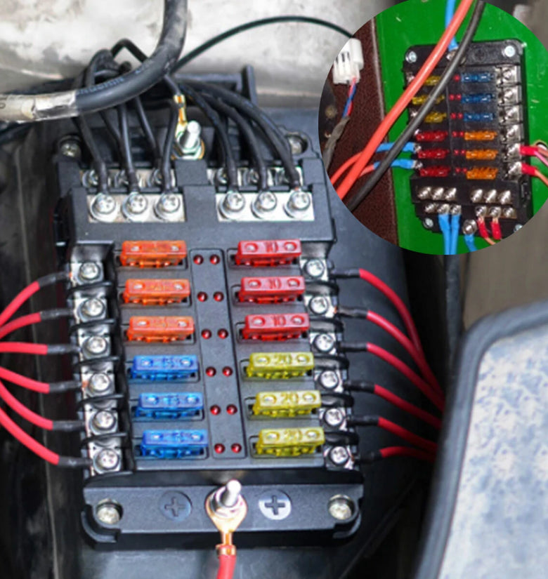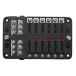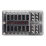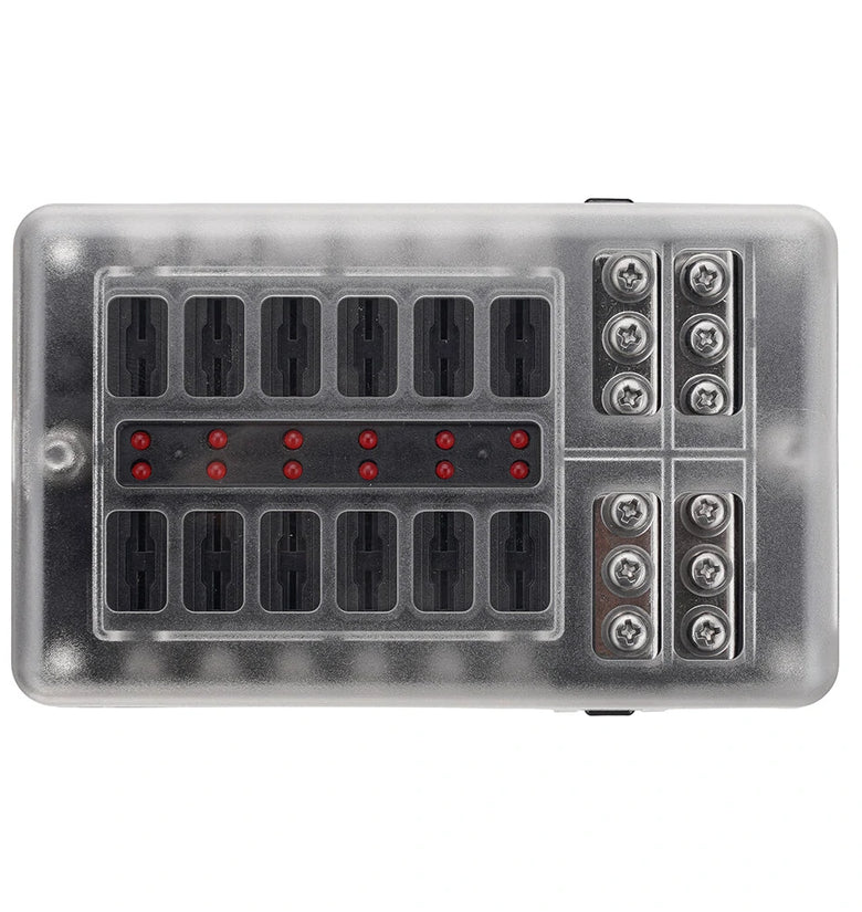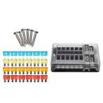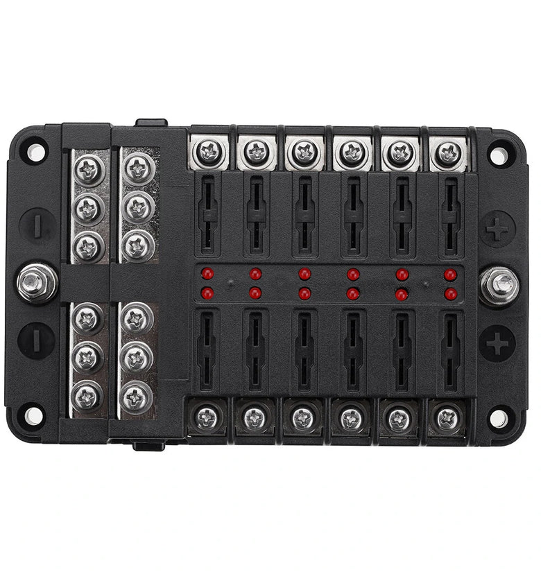 Name: Car Boat Fuse Block 12 Way LED Fuse Junction Box Blade Fuse Terminal Box 12V/24VSpecification:Model:YJ-12FB1714LRaw Material:PBT, PC fire-proof material, nickel plated copper threaded studs, reach the 94-V0 Fire ratingSize:138.25*85*36.5mmUnit Weight:279gOutput:8-32V(it is fitted DC12/24V CAR, BOAT)Rating Current:100ATemperature Range:storage temperature(-30-80℃);using temperature(-25-60℃)Feature:Heavy duty black plastic molded base,durable and long-lasting life.12 Gang with fuse, safe and convenient to use.Overall 100A large current to protect circuit safety.Stud terminals for main positive and negative connections.Combines negative and positive buses on one block.Helps to organize and clean up messy wiring.suitable for using in the car, truck,yacht, etc. Product Included:1X 12 Way Blade Fuse Box Holder1X Labeled Sticker6X Screws6X Orange Fuses6X Red Fuses6X Blue Fuses6X Yellow Fuses