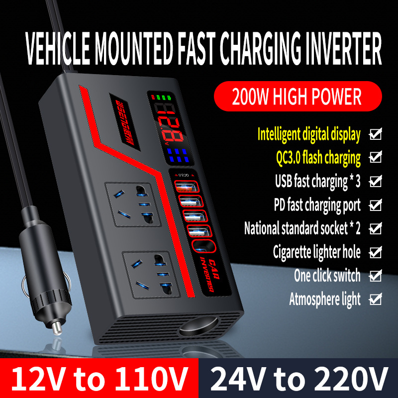 • Car Inverter 12V to 110V 24V to 220V Multi-functional 200W Car Truck Converter Intelligent Digital Display Car Charging Socket