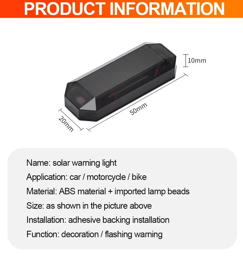 - High-Quality Materials: Made from robust ABS material combined with imported lamp beads, this solar warning light is designed to offer reliable performance over time, ensuring that your vehicle remains visible in various conditions.