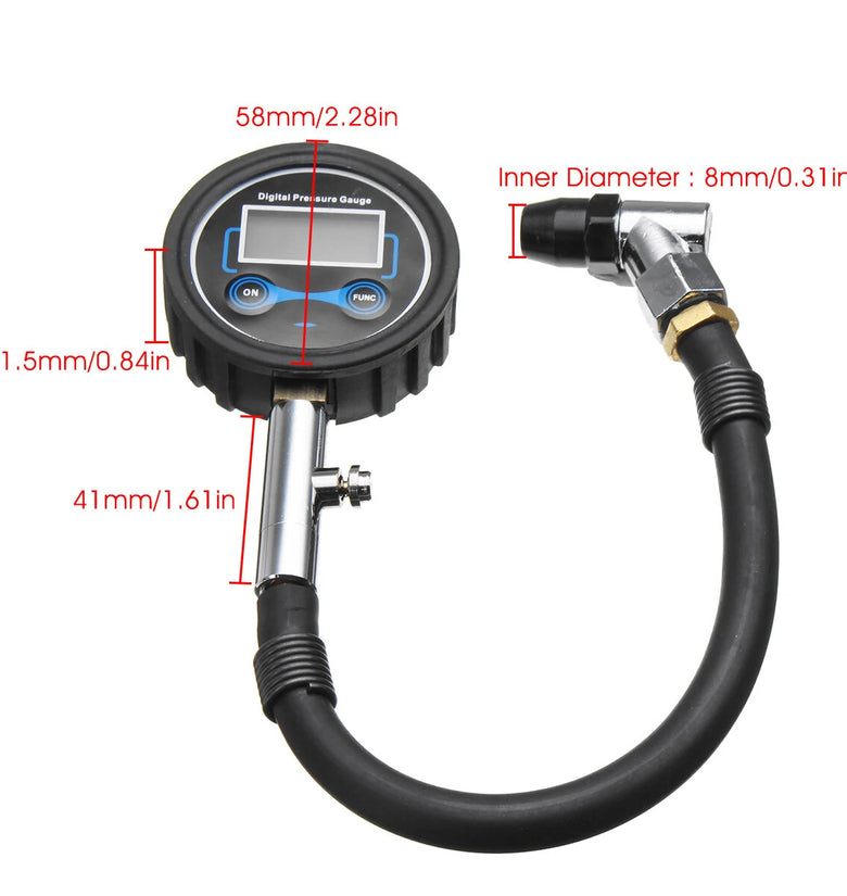 4.Simple push power button to turn it on, select the desired range. Pressure release button for precise adjustment of pressure while on the tire valve.
