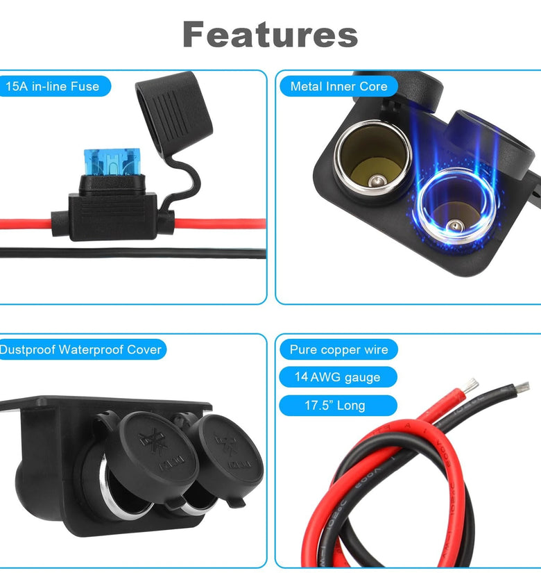 - Enhanced Safety with In-Line Fuse: Equipped with a standard 15A in-line fuse, it offers protection against over-voltage, over-heating, over-load, and short-circuit conditions. Additionally, the waterproof and dustproof cover protects the outlet from sudden water splashes and dust, enhancing its longevity and performance.