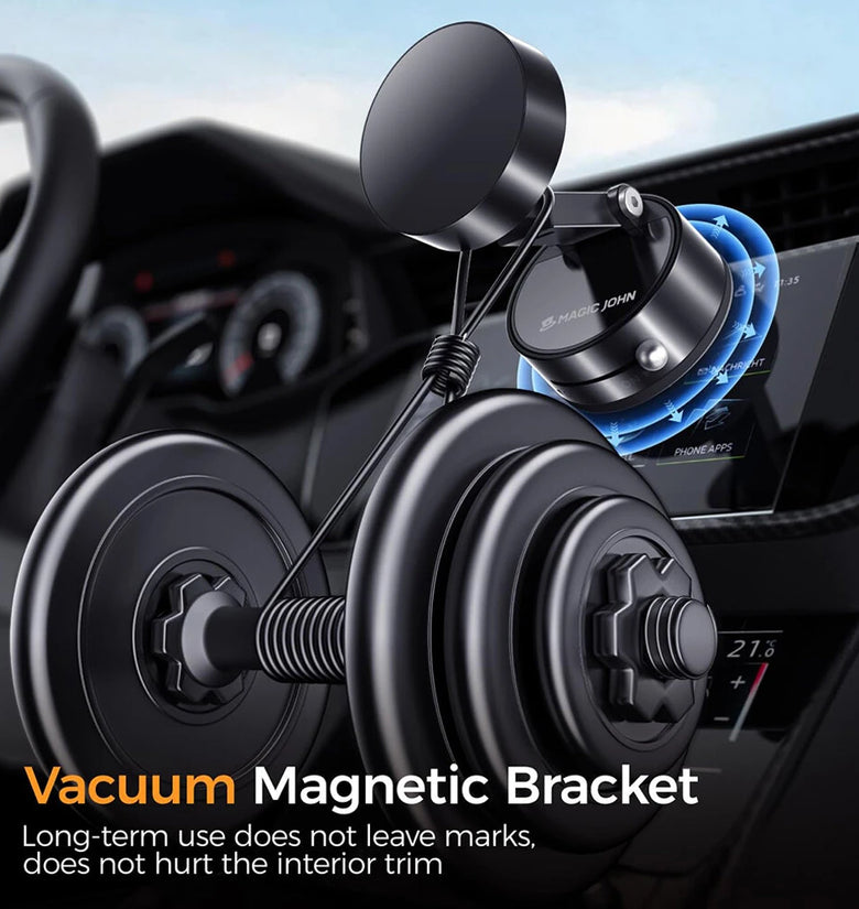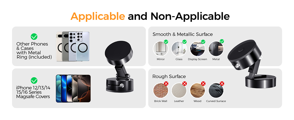 [Warm Tips] Vacuum magnetic suction phone holder adheres to a smooth surface with a vacuum suction cup. When the suction phone holder is used in the car, it can only be attached to smooth surfaces such as the windshield or the car display screen. If the dashboard is made of leather, you can use the included pad to stick it to the dashboard first, then attach the vacuum magnetic holder to the pad. Note: Not applicable to rough surfaces such as leather and wood and non-smooth surfaces.