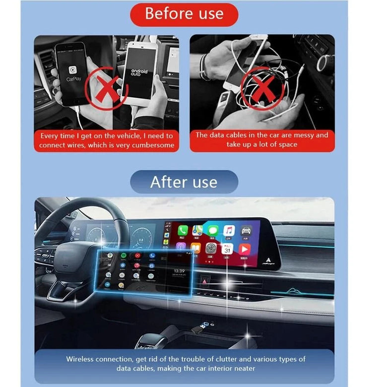 Features:1. Sleek Compact Look: Minimalistic add-on that blends seamlessly into your car’s design with a size smaller than a coin. 2. Transform Wired to Wireless: Upgrades wired CarPlay/Android Auto systems to wireless connectivity, ensuring clutter-free space and eliminating the inconvenience of plugging/unplugging. 3. Wide Compatibility: Designed to work with vehicles featuring factory-wired CarPlay or Android Auto, compatible with for  iPhones (iOS 10+) and Android devices (Android 11+). 4. High-Speed Wireless Connection: Integrated with a 5.8GHz Wi-Fi technology, guaranteeing swift and steady links for uninterrupted usage. 5. Quick Installation Process: User-friendly plug-and-play solution; re-connects automatically within seconds each time the car is started. Note: Not supported for video playback.Package included: