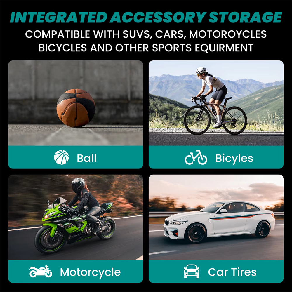 5. Multi-Purpose Use:Ideal for inflating SUVs, cars, motorcycles, bicycles, and sports equipment, making it a versatile tool for various inflation needs.