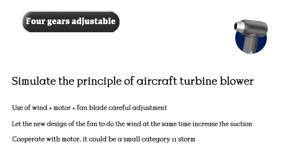 - Adjustable Speed Levels: With four distinct speed settings, you can tailor the fan's performance to meet your specific needs. Easily switch between 35,000rpm, 40,000rpm, 65,000rpm, and 90,000rpm with just a click, allowing for precise control in a variety of scenarios.