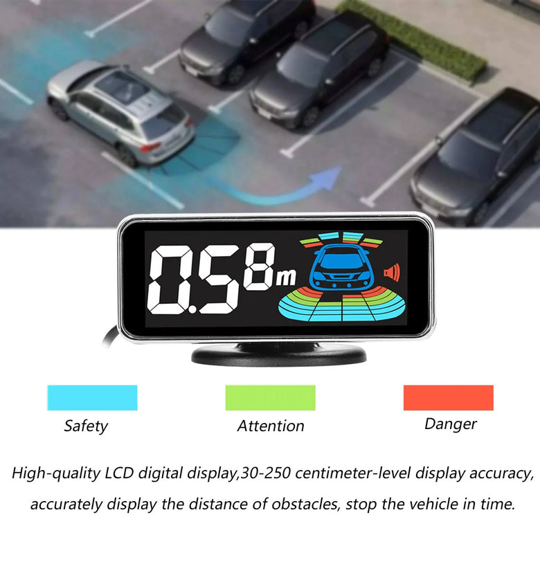 - High-Quality LCD Display: Featuring a premium LCD digital display, it provides real-time visualization with green, yellow, and red 7-segment LED light bars. This easy-to-view display instantly indicates the distance to obstacles, enhancing your awareness and reaction time.
