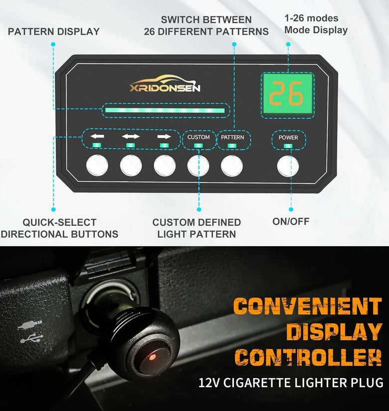 --Simply plug in the 12V switch and control the desired strobe mode, memory function and custom mode function via the display handle. 26 different flash patterns, perfect for late night calls, first aid, storm work or hazards.