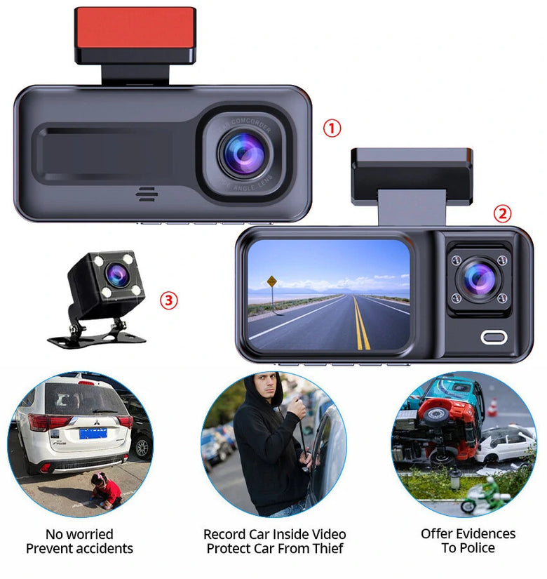 • Full HD 1080P Car Front Windshield DVR Camera 3 Lens Dash Cam with Infrared Night Vision Parking Reverse Assistance