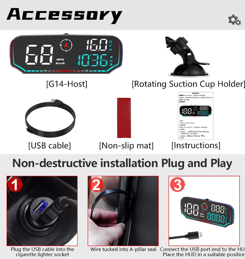 1. Non-destructive installation, plug and play: The vehicle HUD is easy to install, will not cause any damage to the interior of the vehicle, and can be used after installation.