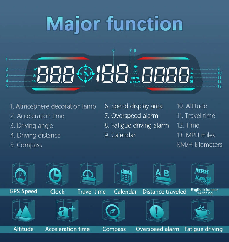 Function: GPS Speed/Clock/Driving Time/Calendar/Driving Distance/Mile/Mile Switch/Altitude Speed Alarm/Acceleration Time/Compass/Drowsy Driving