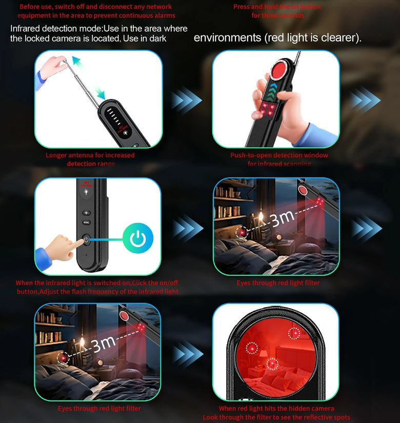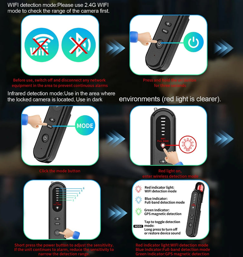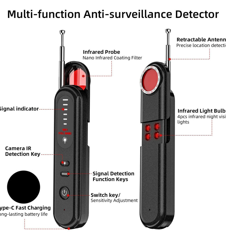 - User-Friendly Operation: With fast-charging capability, extended battery life, and intuitive sensitivity settings, this device provides hassle-free usability for detecting unwanted surveillance gadgets.