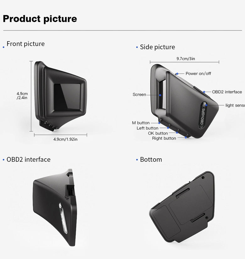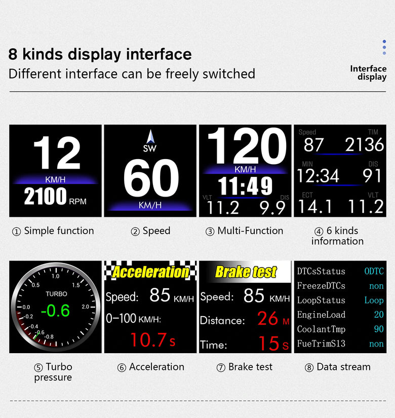 3.GPS mode functions: vehicle speed, voltage, moon time, altitude, number of moon, driving direction, single mileage, driving time, acceleration test, brake test