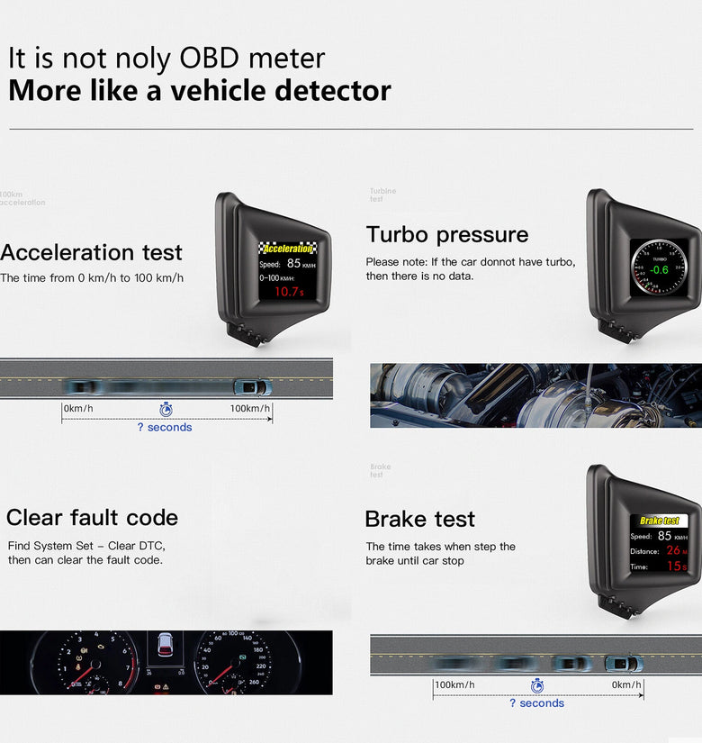 1.OBD mode functions: vehicle speed, water temperature, voltage, fuel consumption, speed, single mileage, total mileage, driving time, driving direction, number of search stars, altitude, time, intake air pressure, oil temperature, air-fuel ratio, turbine pressure, intake air pressure, acceleration test, brake test, clear fault code, read data stream