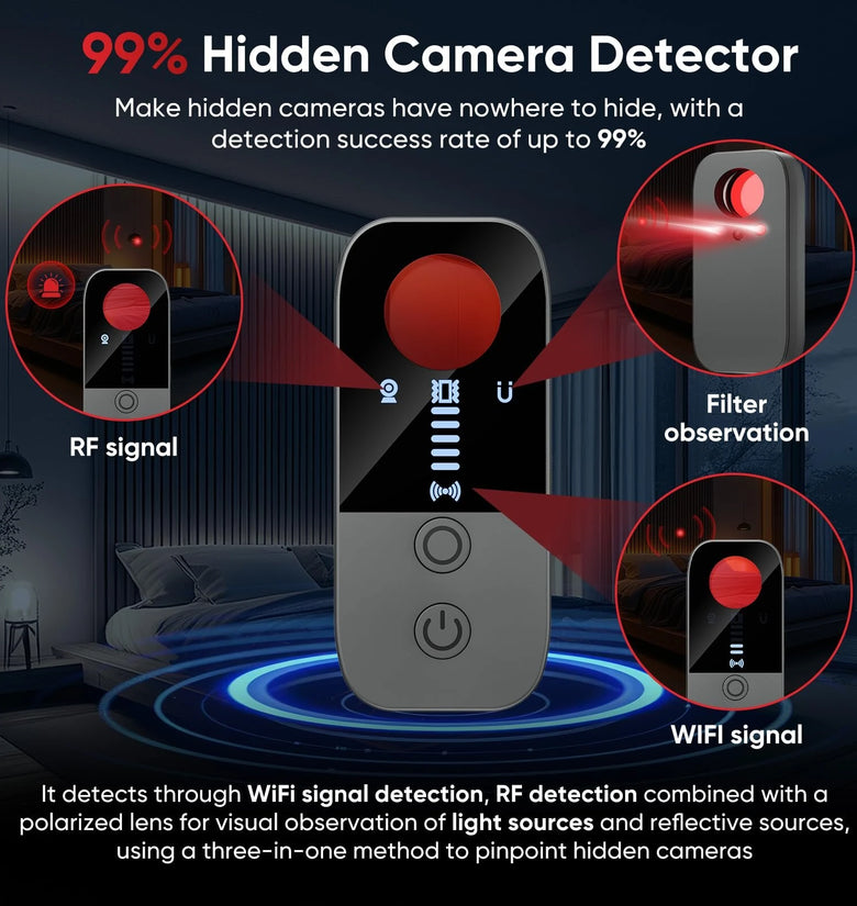 Protect your privacy with a 7-in-1  detector designed to identify Hide camera, GPS trackers, RF signals, and more. Its upgraded smart chip and extended frequency range ensure precise threat detection for ultimate peace of mind in bedrooms, bathrooms, cars, offices, or hotels.