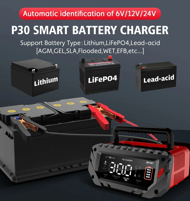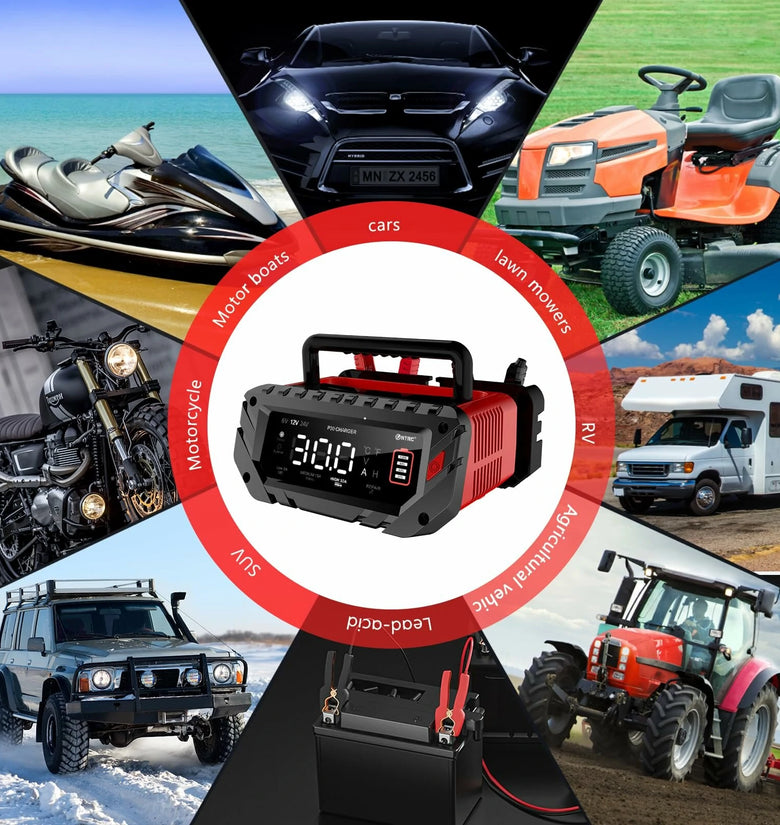 --Our car battery charger can charge all lead-acid batteries (AGM, Gel, SLA, Flooded, VRLA, EFB, MF, WET, etc.), lithium batteries and LiFePo4 batteries, which means it can be used in cars, Boats, trucks, boats, motorcycles, RVs, SUVs, ATVs, lawn mowers, golf carts, tricycles, agricultural vehicles, etc.