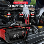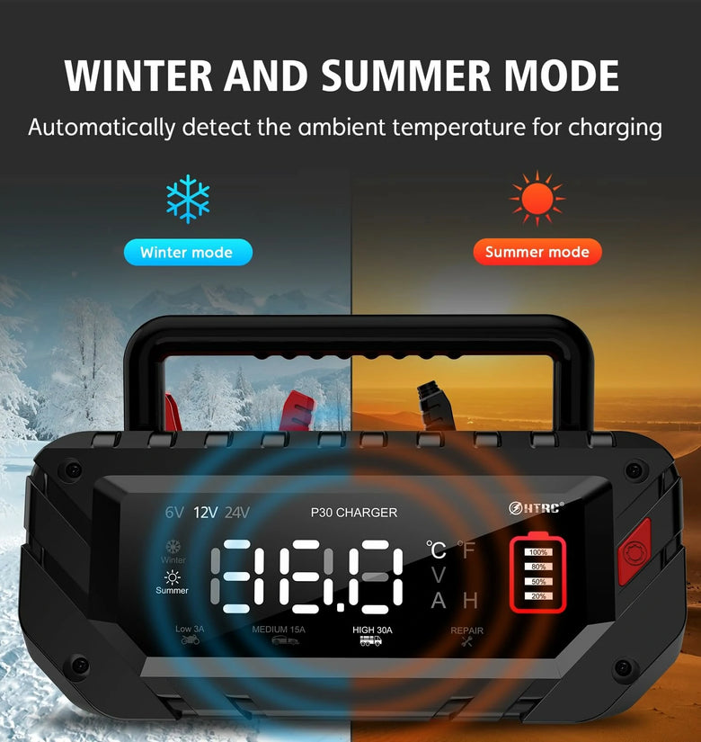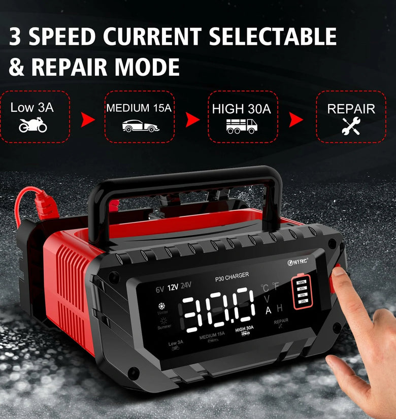 --The car battery charger can automatically detect your battery voltage and you can choose the charging current. Small current charging mode (6V 2A, 12V 3A, 24V 5A). Medium current charging mode (6V 5A, 12V 15A, 24V 10A). High current charging mode (6V 10A, 12V 30A, 24V 16A).