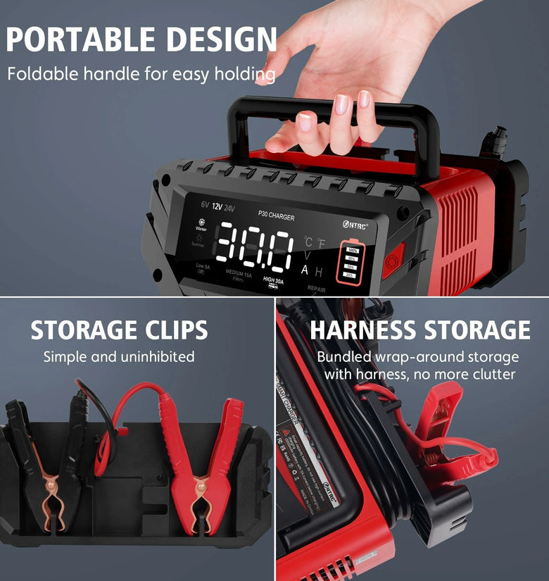 --The charger's top portable handle design and bottom bracket can be folded for easy portability, storage and use. The unique design on the back of the charger allows you to wrap and store messy power cords, and the clips on both sides can also be used to make your charger no longer messy.