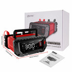-- This portable car battery charger features overcharge protection, overcurrent protection, built-in cooling fan, overheating protection, reverse polarity protection, short circuit protection, no spark contact, and more.