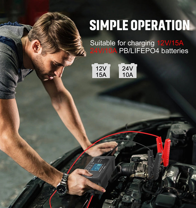 - User-friendly Operation: Simple and straightforward to operate, the charger comes with clearly labeled buttons and a digital display that shows real-time information. It is suitable for charging 12V/15A and 24V/10A PB/LIFEPO4 batteries, making it ideal for both novice and experienced users.