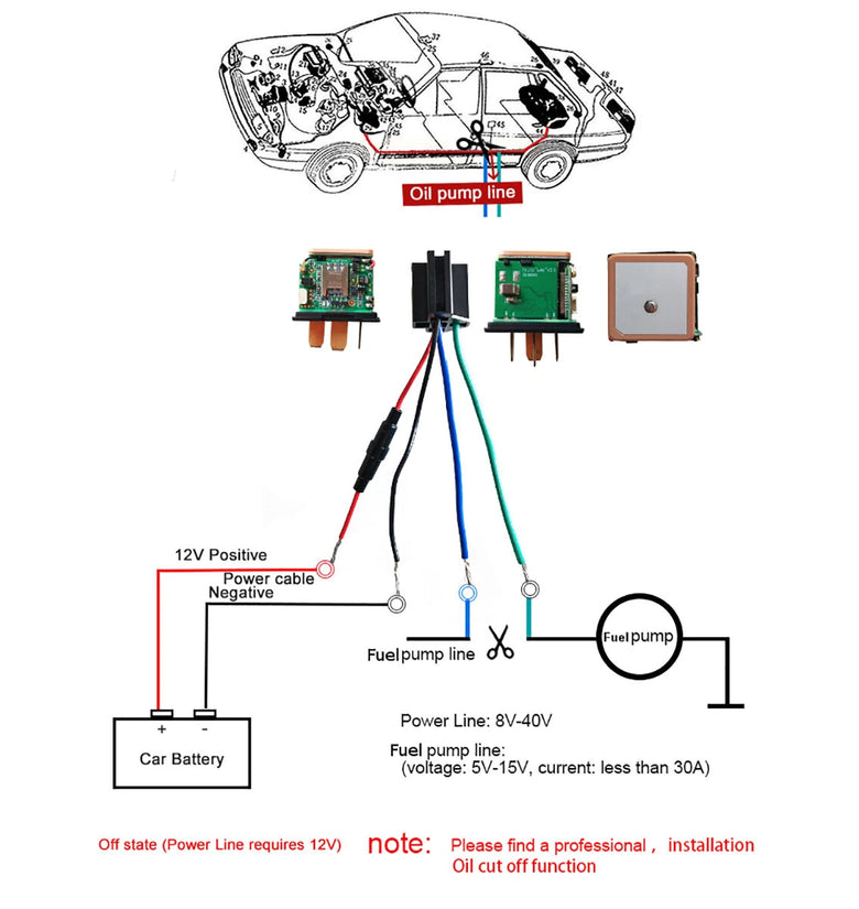 3. Link 12V power supply: (GPS signal: blue light flashes, GSM signal: green light flashes)