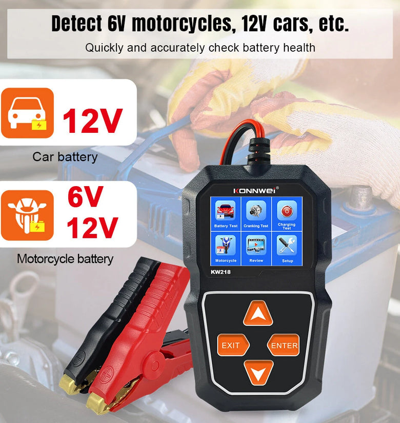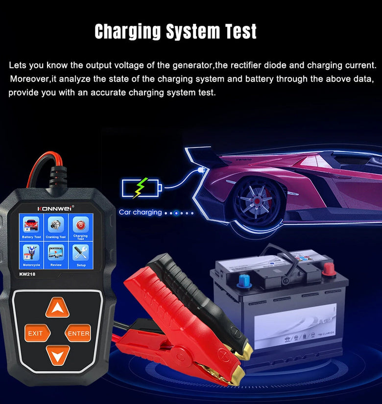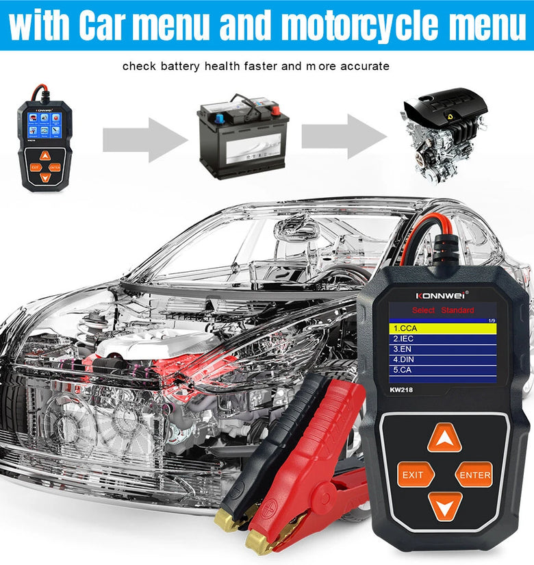 Tired of spending your money, time and energy on expensive mechanics for routine check-ups? Would you like to correctly self-diagnose your car battery? Workshop Automated Battery Tester, Automobile Battery Monitor Car Battery Tester Tool. The KW218 auto battery tester is exactly what you need! KONNWEI KW218 Auto Battery Tester ( Battery Analyzer ). It Can Test all automotive cranking lead acid battery, including ordinary lead acid battery, AGM flat plate battery, AGM spiral battery, and Gel battery, Battery etc on car & motorcycle& Truck& Lawn mower & Steamship.